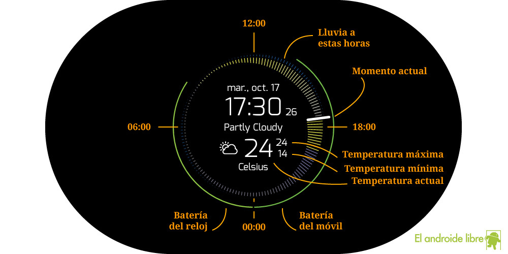 Existe un anillo exterior entre el borde del reloj y el anillo de temperatura que marca lluvia en azul y cuando pulsas sobre la temperatura marca, en color verde, la intensidad del viento. Cuando se muestra el tiempo, en el centro aparece la velocidad y dirección de este.