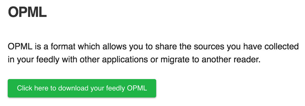 • Pulsamos sobre «Click here to download your feedly OPML«. Se descargará un archivo con todo lo que hayamos guardado en el lector de feeds, categorías incluidas.