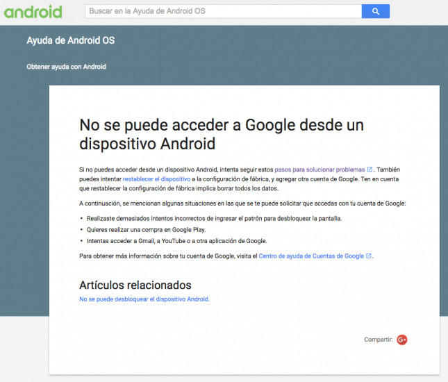 Si nos planteamos buscar ayuda en la documentación oficial de Android sobre ello, encontraremos lo siguiente en la página de ayuda de Android. Esta página nos sugiere tanto restablecer el dispositivo de fábrica (¡esperad a terminar el artículo antes de hacer ese paso!) como acceder a la página de Ayuda de Google para resolver este tipo de conflictos con nuestra cuenta:
