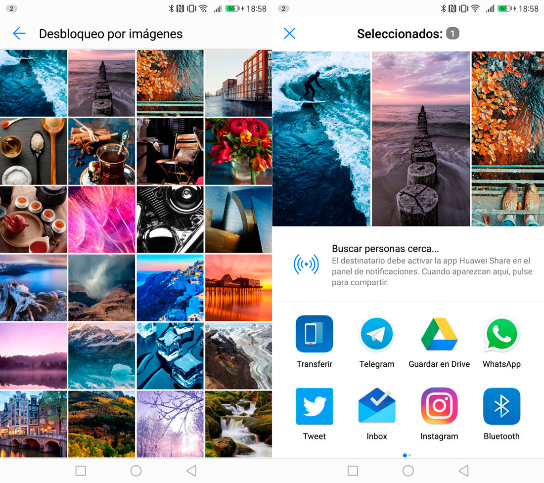 Después de que encuentres la carpeta con las imágenes, basta con que pulses sobre una y despliegues los menús. Aparecerá la opción de «Compartir«. Pulsa en ella, elige la aplicación (WhatsApp, por ejemplo) y completa la acción seleccionando el destinatario. Cuando reciba la imagen, podrá elegirla como fondo de pantalla pulsando sobre los ajustes de la imagen desde su propia galería («Configurar como», «Establecer como»…).