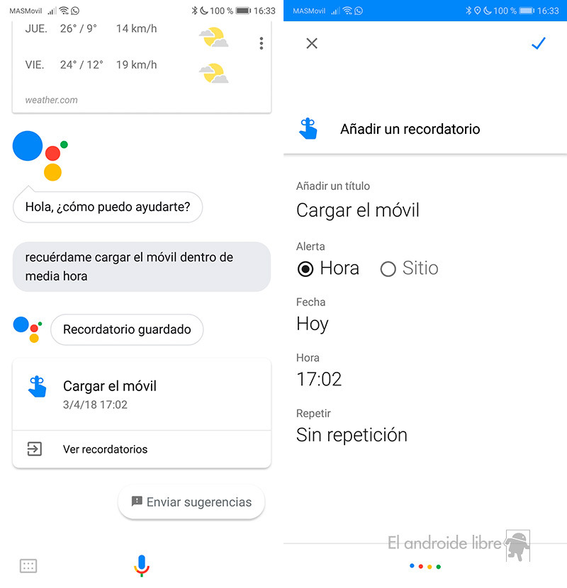La primera forma de crear un recordatorio es posiblemente la más fácil. Usando e Asistente de Google ya os contamos que había decenas de comandos disponibles. Uno de ellos es el que nos permite recordar algunas tareas sencillas e incluso podemos decirle el momento en el que queremos que nos avise.