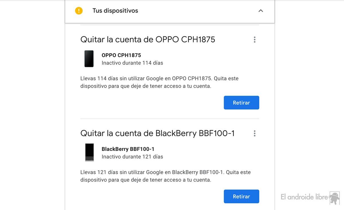 • Google te dirá las advertencias de seguridad que tengas pendientes. Es recomendable que las arregles: entre ellas está la opción de quitar las cuentas a distancia. Se encuentra dentro de «Tus dispositivos«.