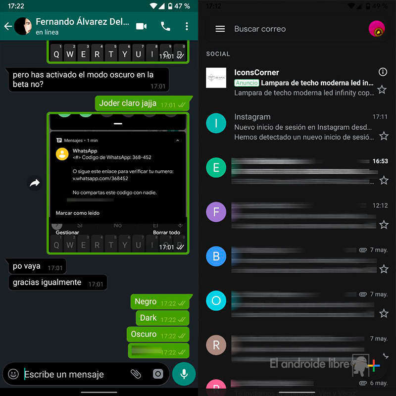 En otras aplicaciones, como Telegram, es posible que no veamos bien los textos, si bien en este caso podemos cambiar el tema para que se ajuste a lo que necesitamos. En la imagen superior vemos cómo se ve por defecto en la parte izquierda y cómo se ve tras cambiar el tema.