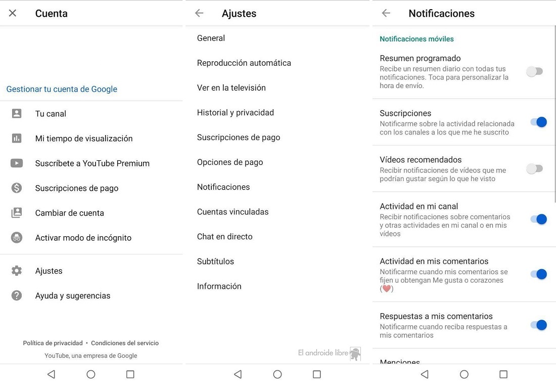 Si lo que se desea es gestionar las notificaciones, podemos acudir a los ajustes de la cuenta en la app de YouTube en Android. Aquí nos encontraremos con la posibilidad de activar o desactivar determinadas notificaciones; lo que nos permitirá reducir la cantidad de ellas que recibimos al cabo del día. Cuáles son las notificaciones que se deben mantener es algo muy personal que depende en parte del uso de la app.