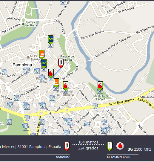 El uso es sencillísimo, tan solo tenemos que escribir la calle, o población que queramos y nos aparecerá marcada en el mapa, así como las antenas cercanas. Para ver de que compañía son, solo tenemos que pinchar encima de la antena que queramos y nos saldrá el logotipo de la compañía y la distancia e intensidad.