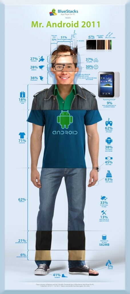 Pues eso es un poco lo que han intentado los chicos de Bluestacks, sólo que en lugar de pulverizar miles de personas han usado estadísticas de usuarios Android y han creado esta interesante imagen que muestra cómo sería un usuario Android medio, o mejor dicho, la mezcla de todos ellos, o de casi todos.