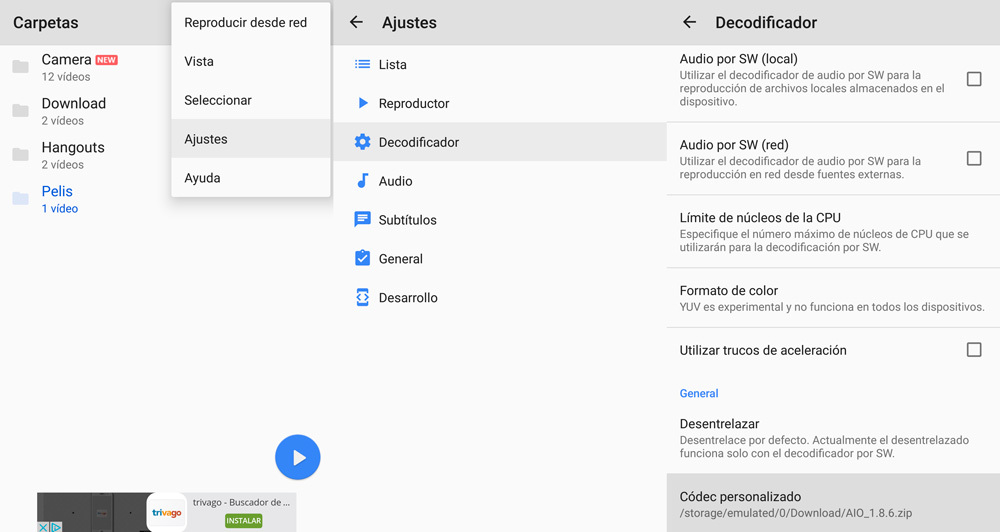 A continuación, deberemos abrir MX Player y dirigirnos a «ajustes» y ahí entrar en la opción «decodificador». Una vez allí, bajaremos hasta la opción que está más abajo, «Códec personalizado». Entonces nos aparecerá una ventana en la que deberemos elegir el archivo ZIP que hemos descargado antes.