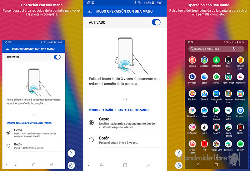 Para poder activar el modo a una mano que disminuye la diagonal usable hemos de ir a: