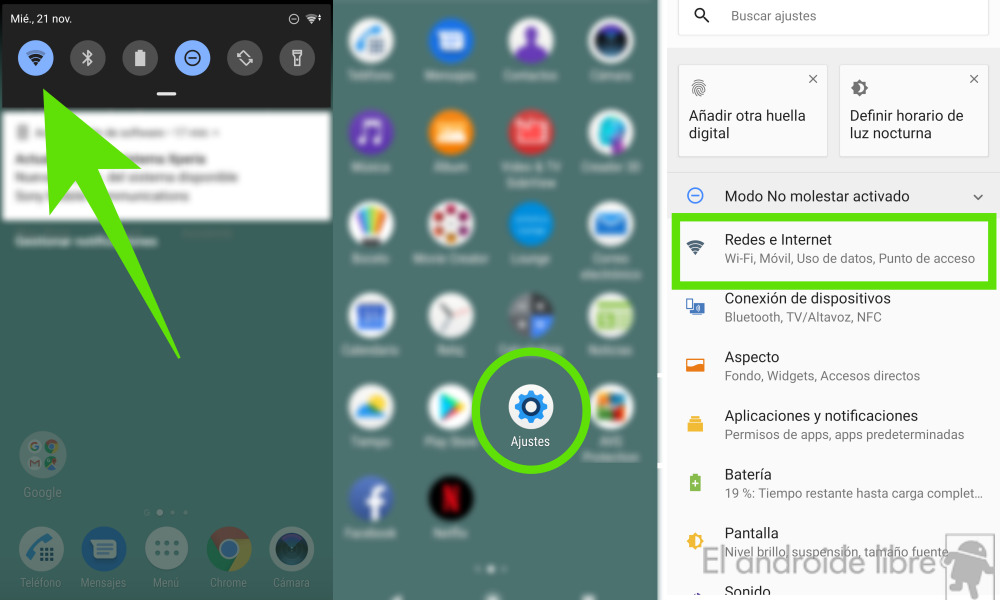1. El primer paso es entrar en los ajustes de nuestro terminal para acceder a la pestaña de «Redes e Internet» o simplemente «Wifi». También podemos deslizar el menú con las opciones rápidas y mantener el icono de Wifi, se nos abrirán los ajustes directamente.