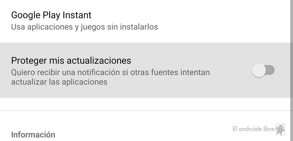 - Busca la opción «Proteger mis actualizaciones«: tu móvil te avisará si una aplicación intenta actualizarse en secreto o actualizar a otras.