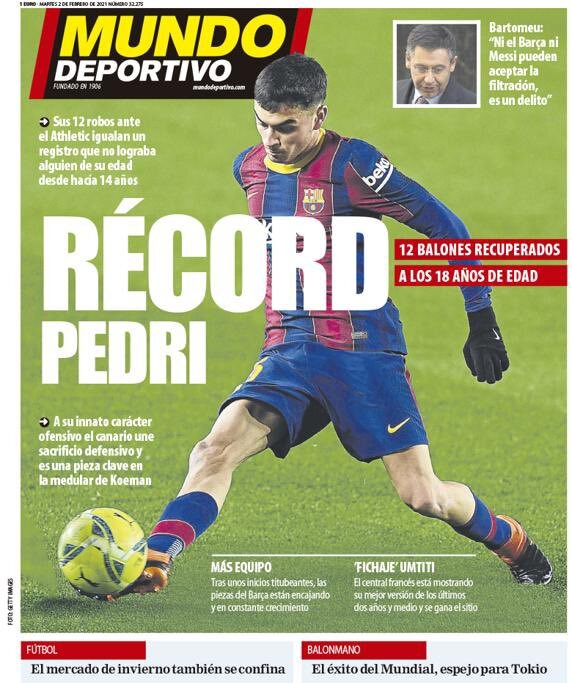 "Récord Pedri", así titula el diario Mundo Deportivo su portada de este martes 2 de febrero. El joven futbolista del Barcelona, de 18 años, con sus 12 robos en el partido frente al Athletic ha igualado una marca que no se registraba desde hace catorce años.