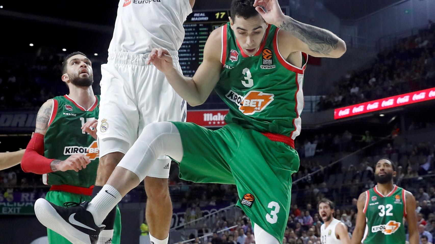 El alero sueco del Real Madrid Jeffery Taylor (c) efectúa un mate ante los jugadores del Kirolbet Baskonia Vincent Poirier (i) y Luca Vildoza durante el partido de la tercera jornada de Euroliga que se disputa esta noche en el Wizink Center.