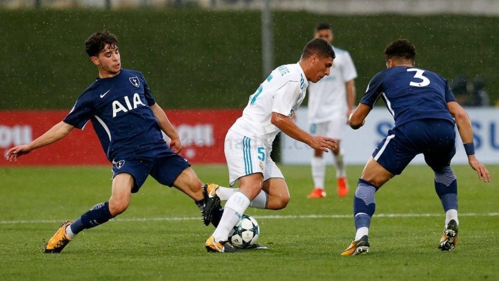 Remate de cabeza de varios jugadores del Juvenil y Tottenham