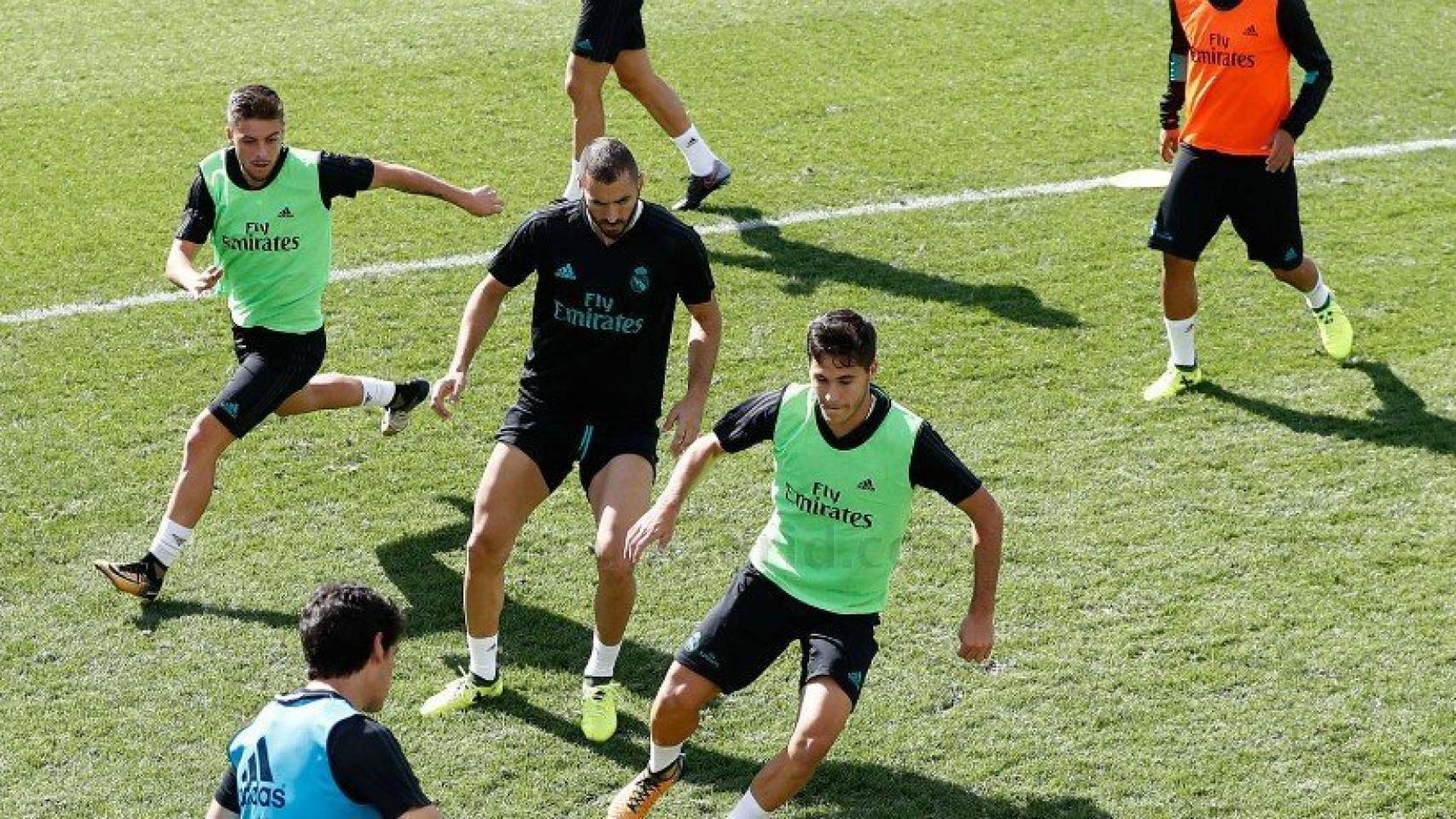 Benzema entrena en Valdebebas junto a un jugador del Castilla