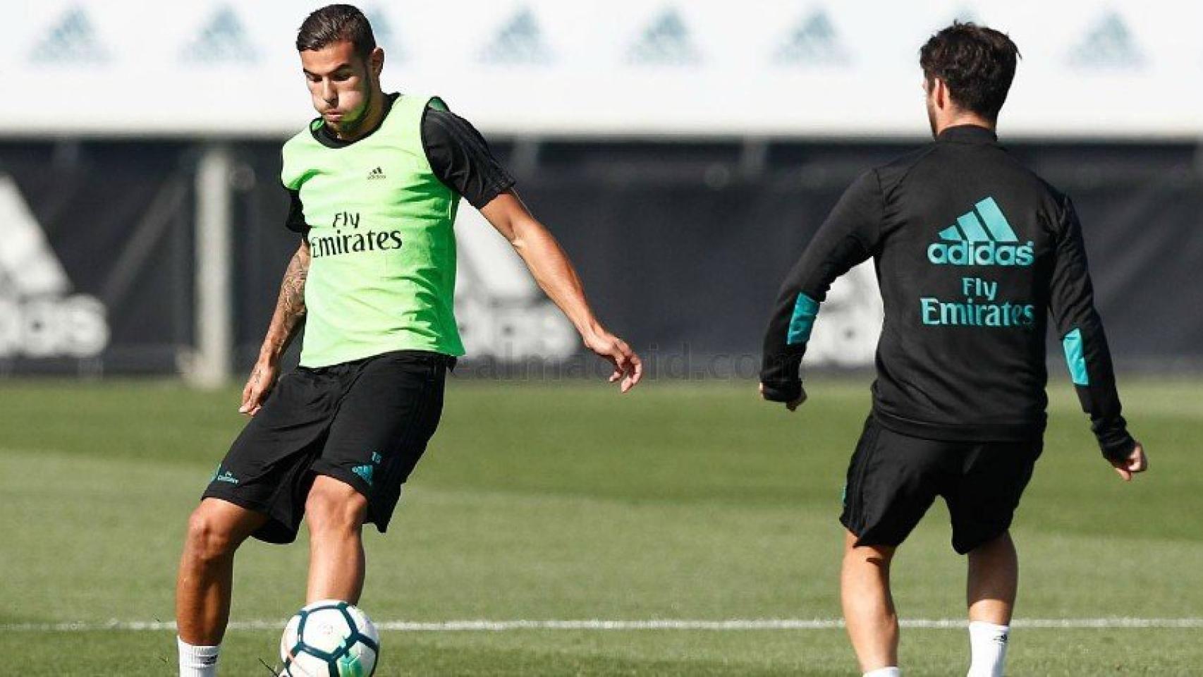 Casemiro intenta controlar el esférico ante Marcelo y Marcos Llorente
