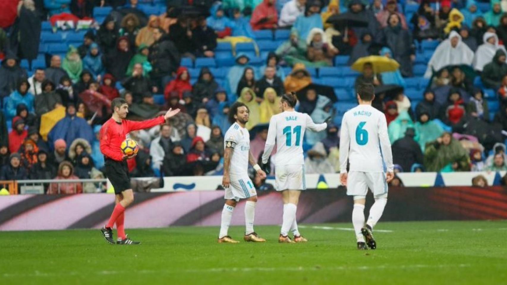 Los jugadores del Madrid reclaman una acción al árbitro. Foto: Manu Laya / El Bernabéu