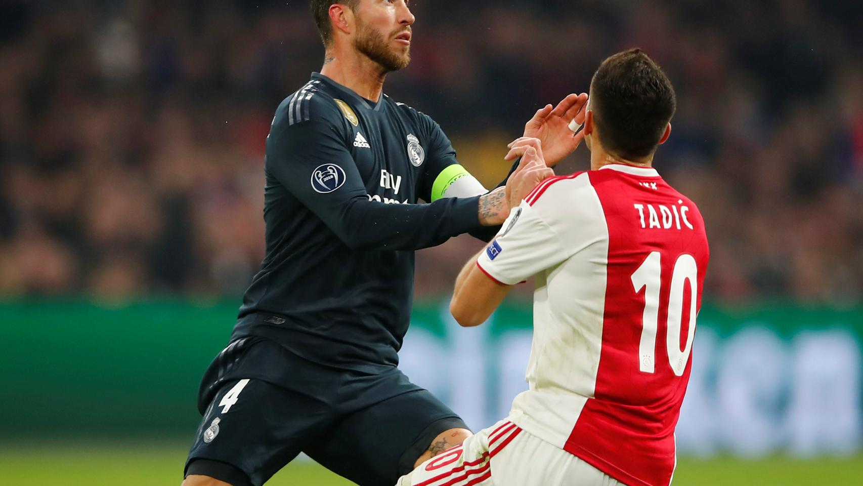 Sergio Ramos ve la tarjeta amarilla ante el Ajax