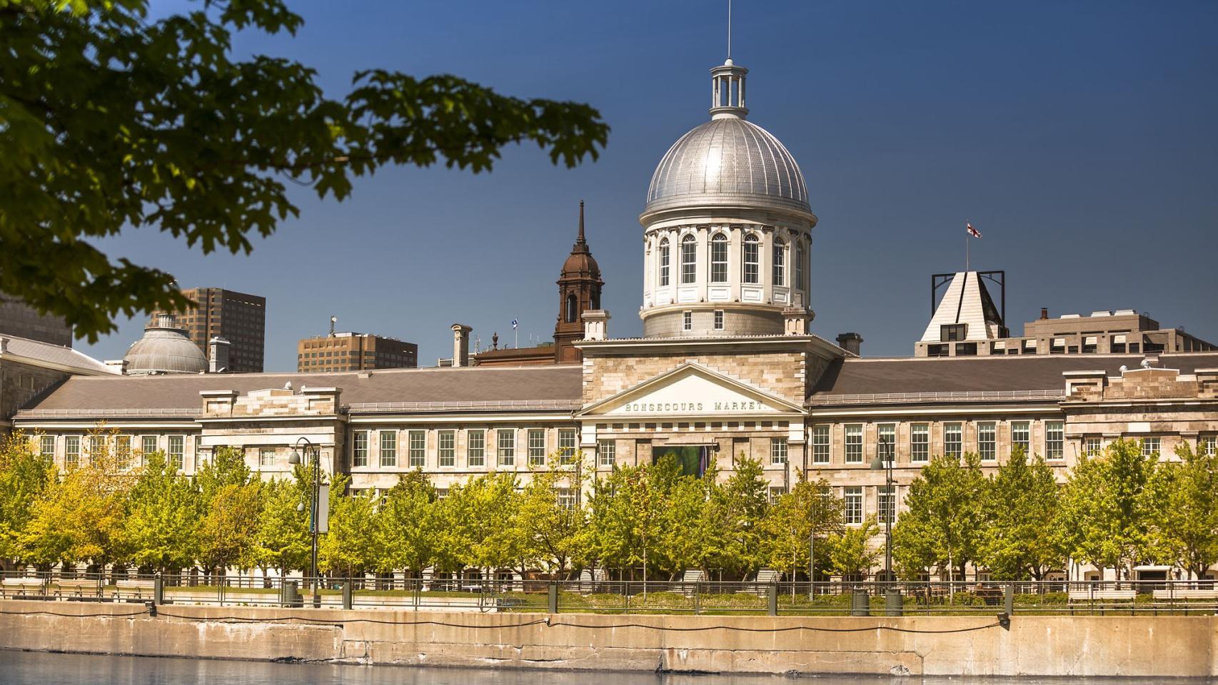 La entrada del hotel es amplia y luce la bandera de Canadá en la parte superior