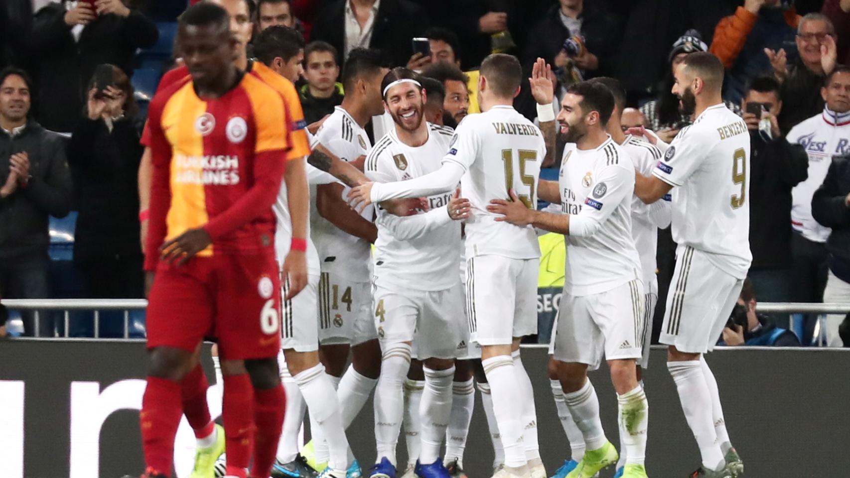 Sergio Ramos celebra con sus compañeros su gol al Galatasaray