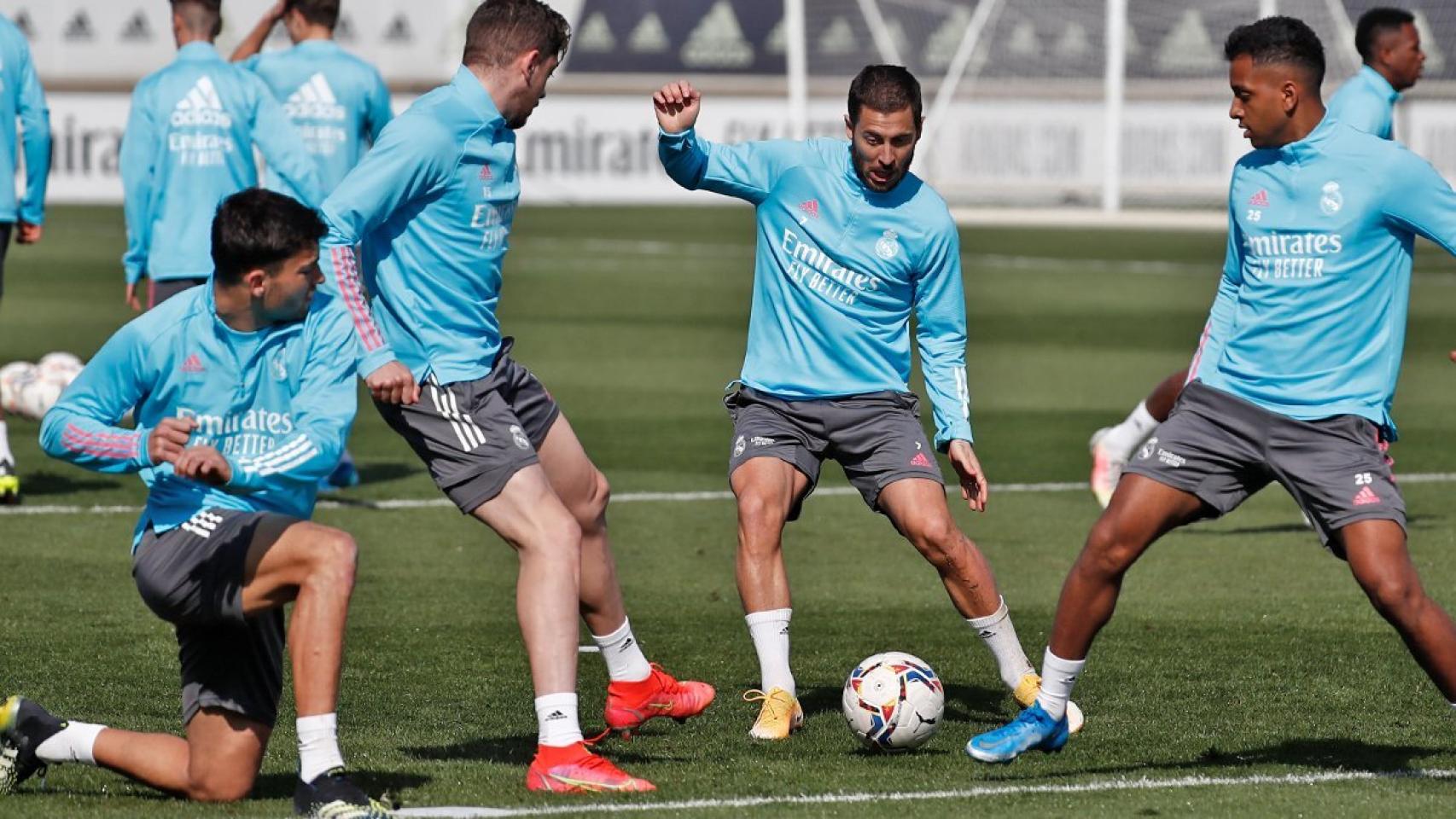 Eden Hazard y Nacho Fernández, durante un entrenamiento con el Real Marid
