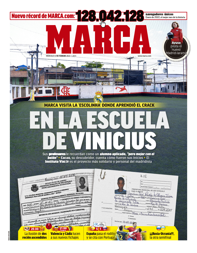 "En la escuela de Vinicius", así titula el diario MARCA su portada de este miércoles 2 de febrero del 2022. El medio madrileño ha visitado la 'Escolinha'. Allí dio sus primeros pasos Vinicius Júnior. Sus profesores le recuerdan como un alumno aplicado, pero "mejor con el balón".