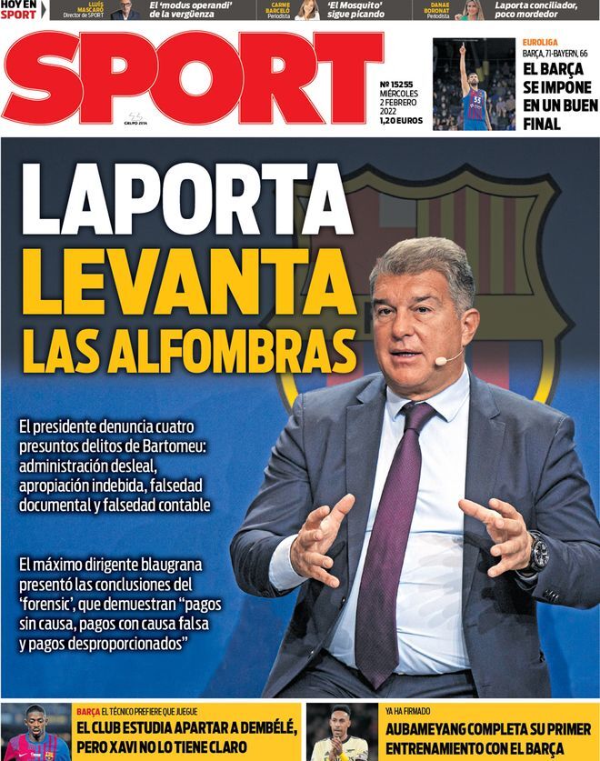 "Laporta levanta las alfombras", así titula la portada del diario Sport en su edición de este miércoles 2 de febrero del 2022. Joan Laporta ha denunciado a Josep Maria Bartomeu por cuatro delitos que cometió cuando era presidente del Fútbol Club Barcelona.