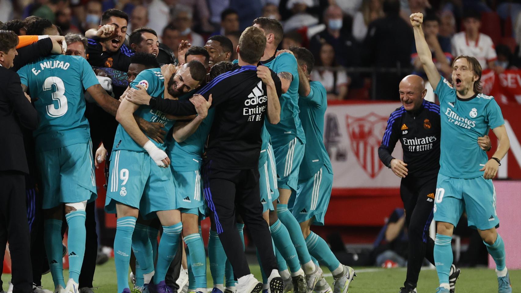 Los jugadores del Real Madrid celebran el gol de la victoria en el descuento de Karim Benzema al Sevilla