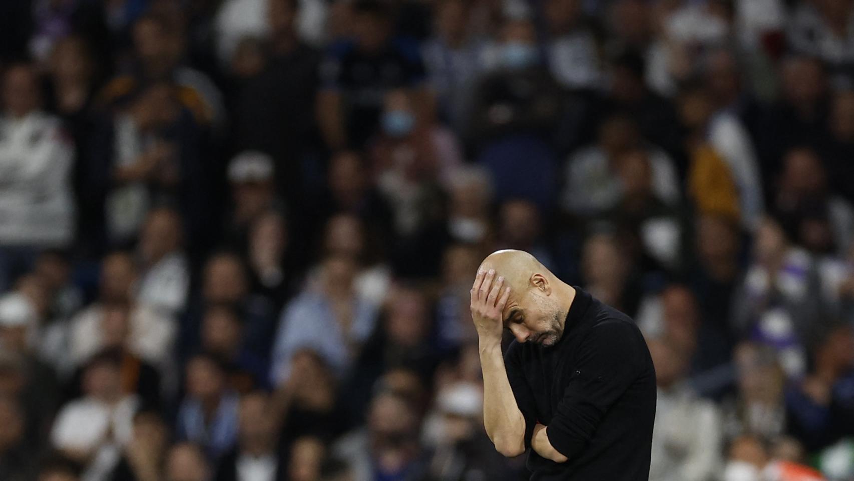 Pep Guardiola siguiendo el Real Madrid - Manchester City desde la banda del Santiago Bernabéu