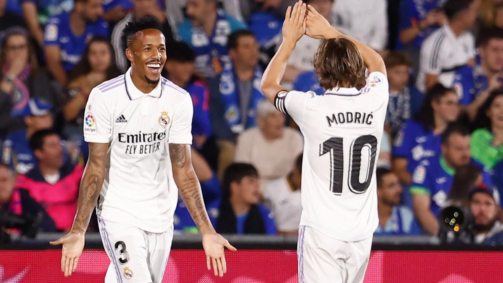 Militao celebra con Modric su gol.