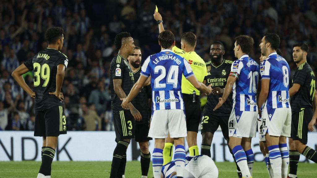 Pulido Santana vuelve a mostrar una amarilla a un jugador del Real Madrid. Y otra vez por lo que, aparentemente, parece ser una protesta. Se la lleva Dani Ceballos después de una falta peligrosa señalada a favor de los donostiarras.