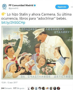 "Lo hizo Stalin y ahora Carmena. Su última ocurrencia, libros para 'adoctrinar' bebés", es el mensaje que ha lanzado la cuenta de Twitter del PP de Madrid a primera hora de esta tarde, acompañada de una ilustración propagandística de la época soviética en la que se dibuja a Stalin abrazando a niños sonrientes que portan juguetes y dibujos.