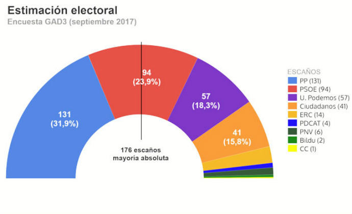 El PP resiste y el PSOE sube con fuerza en plena crisis catalana. Esta es la principal conclusión de dos encuestas que se publican este domingo en la prensa nacional, una de Sigma Dos para el diario El Mundo y otra de GAD3 para ABC. Según la encuesta de El Mundo, el PP se mantiene con más o menos fuerza en la primera plaza, aunque el PSOE está subiendo mientras que Podemos y Ciudadanos se encuentran actualmente a la baja. El PP obtendría el 30,8 por cientos de los votos, mientras el PSOE crece hasta el 26,4 por ciento. Podemos se mantiene en la tercera plaza con el 19,5 por ciento y Ciudadanos se queda con un 12,7 por ciento.