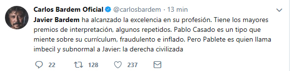 Como es lógico, los partidarios y detractores de Casado no han tardado de comentar el asunto, que se ha convertido en 'trending topic' y ha puesto entre los temas del día al propio Javier Bardem. Y, entre los defensores del actor, ha salido de forma enérgica uno muy cercano, su hermano Carlos, que ha aprovechado para comparar el currículum de ambos y lanzarle un dardo envenenado al presidente del PP.