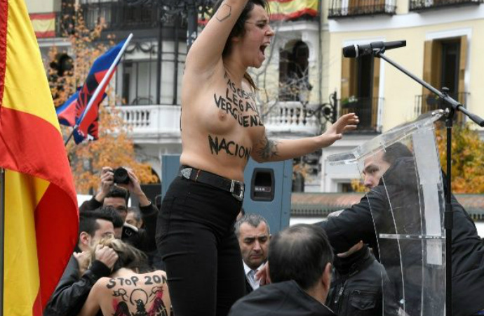 Tres activistas de Femen irrumpen semidesnudas en un acto de Falange