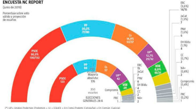 En el análisis pormenorizado por partidos,el más beneficiado en caso de repetición electoral sería el Partido Popular, explica ABC.Pablo Casado subiría 19 escaños hasta los 85 a costa de un importante batacazo de Vox (–15 hasta unos exiguos 9 diputados). Estos datos consolidanel resultado del 26–M, cuando una parte del votante de derechas recapacitó en su voto entregado a Vox en las generales y volvió a los populares. El PP conseguiría cuatro puntos más, hasta un 20,6 por ciento de sufragios; y Vox un 5,6%, lo que supone bajar a casi la mitad del 10,3% alcanzado el 28–A.