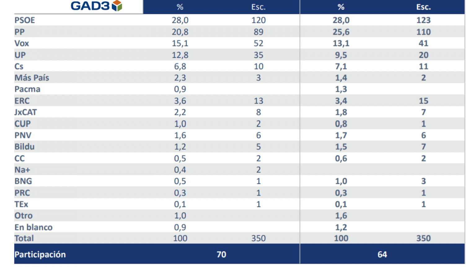 Además, Ciudadanos también sube, superando ligeramente los resultados de su fracaso electoral de hace un año, cuando se quedó en el 6,8 % y sólo diez escaños. Ahora GAD3 le atribuye un 7,1 % y 11 diputados.