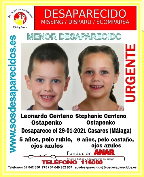 SOS Desaparecidos pide la colaboración ciudadana para encontrar aStephanie y LeonardoCenteno Ostapenko, doshermanos de seis y cinco añosque desaparecieron el pasado mes de enero en Casares (Málaga).