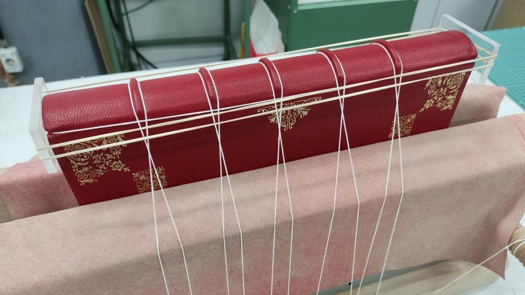 Ha sido escartivanado y cosido en telar con cinco cordeles, cuenta con cabezas bordadas con hilo de seda de dos colores y presenta una encuadernación clásica.