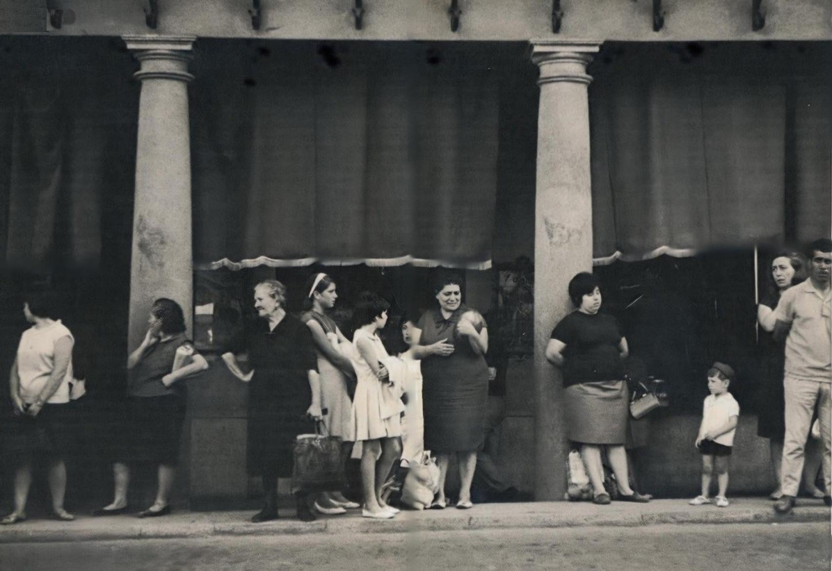 Entre ellas, destacan una en la que aparecen un grupo de toledanos esperando al autobús urbano, conocido como 'katanga' en la ciudad, en los soportales de la Plaza de Zocodover. U otras en la que retrata a una niña vestida de comunión y a un tendero.
