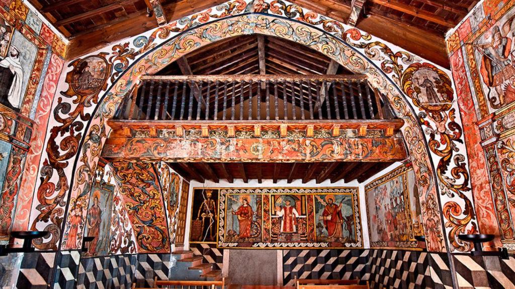 Este edificio, construido en 1570 y declarado Bien de Interés Cultural en 1976, destaca por la originalidad de su espacio interior y por sus murales, que están considerados como la mejor colección de pintura popular del siglo XVIII a nivel nacional. Fueron realizados entre los años 1734 y 1735 por un autor anónimo y adornan todos los rincones del templo: retablos, cortinas, arquitecturas ilusorias...