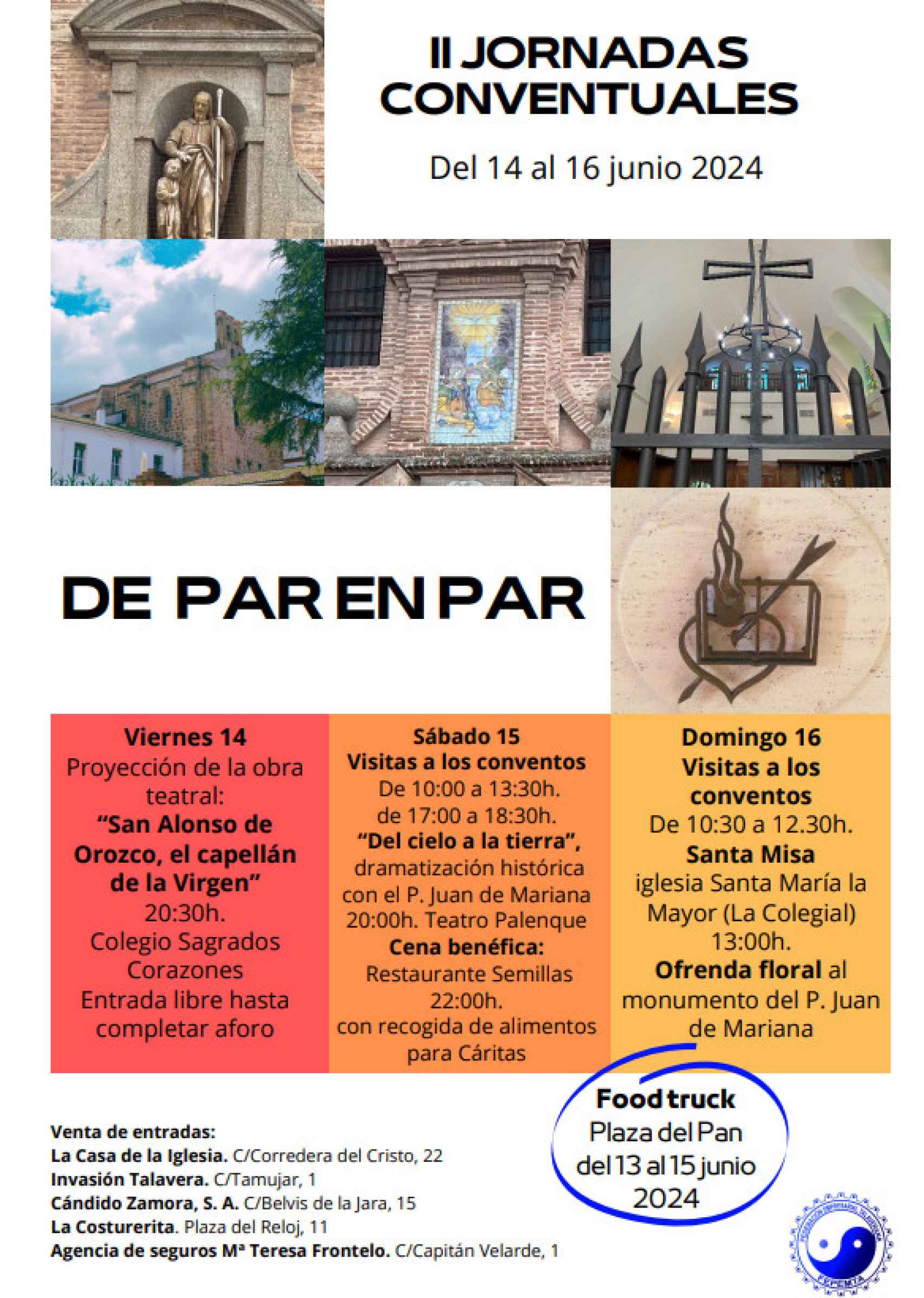 Las jornadas pivotarán en torno a dos importantes figuras de Talavera de la Reina, San Alonso de Orozco y Padre Juan de Mariana. Por ello, contarán con la proyección de la obra teatral 'San Alonso de Orozco, el capellán de la Virgen' (en el colegio Sagrados Corazones el viernes 14) y con la representación teatral 'Del cielo a la tierra', dramatización histórica con el Padre Juan de Mariana (en el Teatro Palenque el sábado 15).