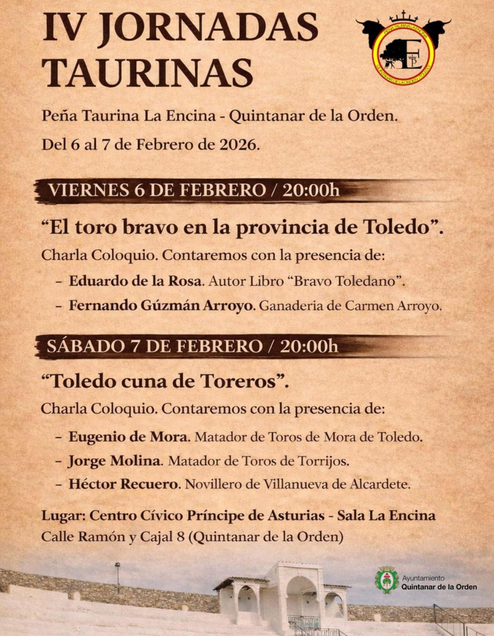 Quintanar de la Orden (Toledo) celebrará los próximos viernes 6 y sábado 7 de febrero sus IV Jornadas Culturales Taurinas, organizadas por la Peña Taurina La Encina, con ganaderías y toreros de la provincia toledana como ejes principales del programa.