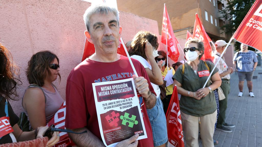 "Estos trabajadores y estas trabajadoras han superado un proceso selectivo, han aprobado una oposición, pero sus contratos son de diez meses. En los meses de julio y agosto se van a ir al paro. Lo que exigimos para ellos y ellas son contrataciones a jornada completa y los doce meses del año", ha señalado en la concentración de Toledo el secretario general de CCOO-Enseñanza en la provincia, Bernardino Mendoza.