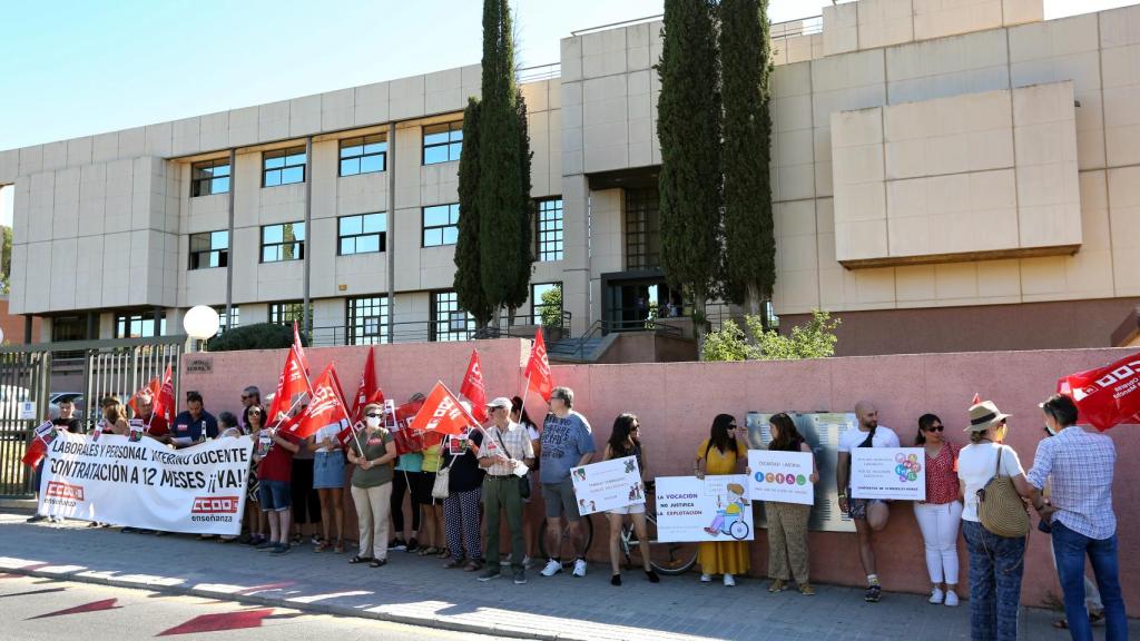 Sindicalistas de CCOO-Enseñanza y trabajadores afectados por el despido de personal de centros de enseñanza públicos se han concentrado esta mañana ante las cinco delegaciones provinciales de la Consejería de Educación, Cultura y Deportes para denunciar la "precariedad" que sufre el personal laboral, "mayoritariamente contratado a tiempo parcial y solo durante diez meses al año".