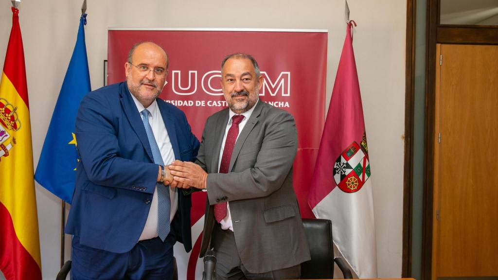 El rector de la Universidad, Julián Garde, y el vicepresidente regional, José Luis Martínez Guijarro, han sido los encargados de firmar este convenio.