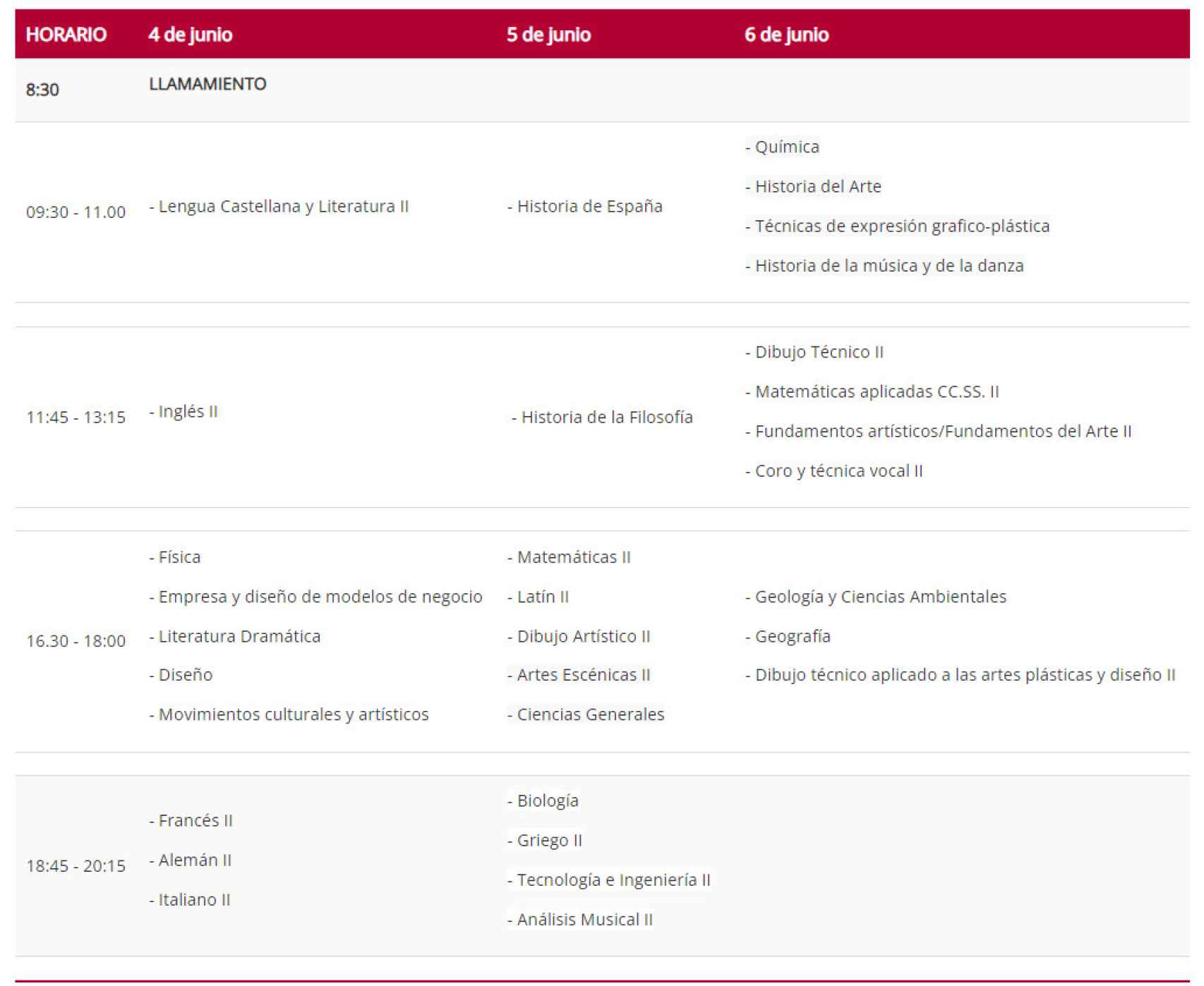 Los horarios de cada uno de los exámenes puede consultarse en el siguiente cuadro: