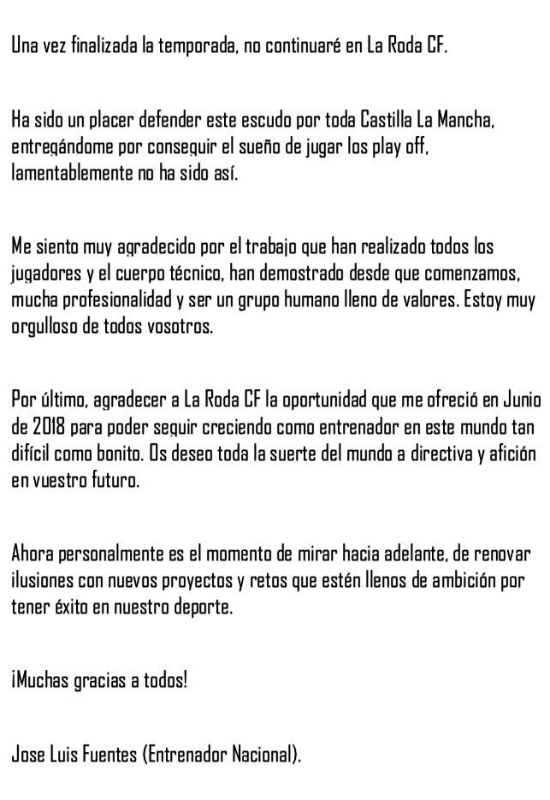José Luis Fuentes ha anunciado este miércoles a través de un comunicado que no seguirá al frente de La Roda. El técnico albaceteño, que tomaba los mandos del cuadro rodense a comienzos de temporada después de una gran campaña al frente del Ibañés, asegura que "ahora personalmente es el momento de mirar hacia delante, de renovar ilusiones con nuevos proyectos y retos que estén llenos de ambición por tener éxito en nuestro deporte."