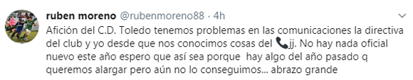 El CD Toledo da por hecho que el delantero Rubén Moreno continuará otra temporada equipo, mientras que el defensa Fernando Albert Sanz 'Chato', ha decidido dejar la disciplina del club. Del mismo, tampoco seguirá en la entidad capitalina Iván Bueno, extremo que ha cuajado una excelente campaña y que se antojaba muy difícil retener.