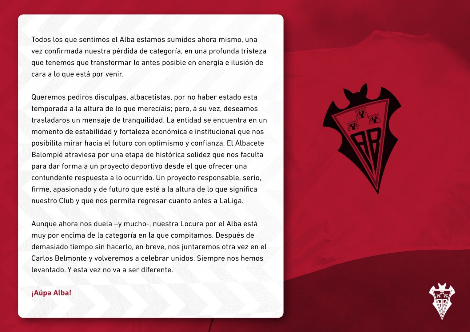 En esa misma línea, a través de esa nota oficial, los directivos de la entidad manchega piden “disculpas” a la afición albaceteña “por no haber estado a la altura” de lo que merece, aunque, a su vez, han tratado de enviar un mensaje de “tranquilidad”.