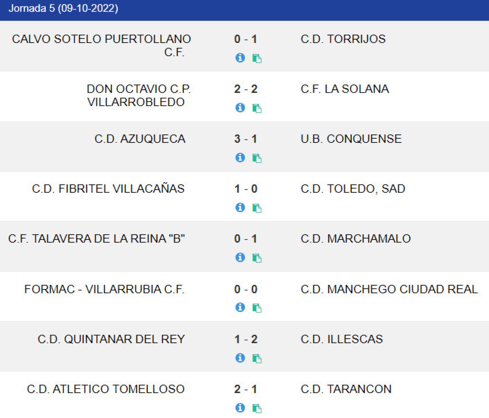 De esta manera, en estos momentos la nómina de equipos que no conocen todavía la victoria se reduce a dos: CF Talavera B y Conquense. Los cerámicos, últimos con dos puntos, caían en casa por 0-1 ante el Marchamalo, mientras que el Azuqueca superaba por 3-1 al Conquense.